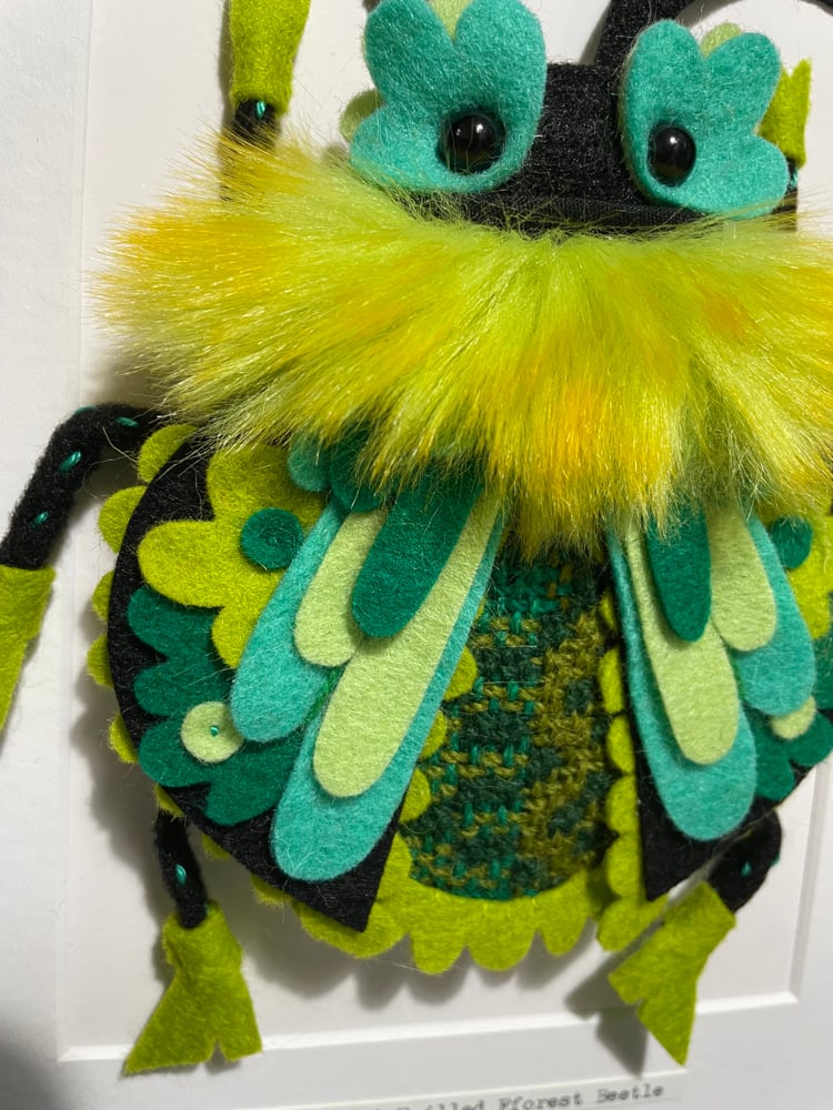 3D hand-stitched felt, fake fur & vintage Welsh tapestry tweed beetle in deep box frame with Perspex glass that can be removed if desired.