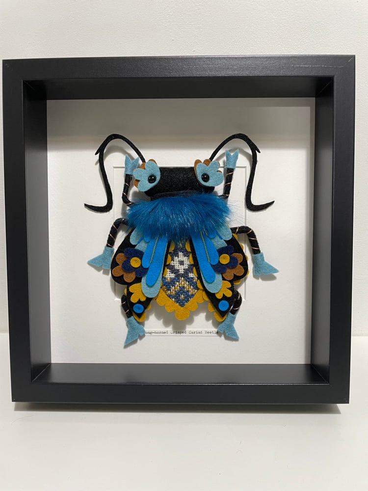 3D hand-stitched felt, fake fur & vintage Welsh tapestry tweed beetle in deep box frame with Perspex glass that can be removed if desired.