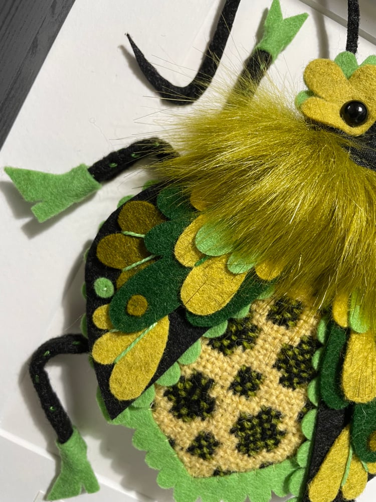 3D hand-stitched felt, fake fur & vintage Welsh tapestry tweed beetle in deep box frame with Perspex glass that can be removed if desired.