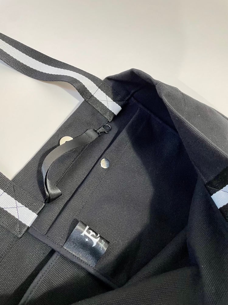 100% cotton canvas with white flocked character detail with striped shoulder strap.